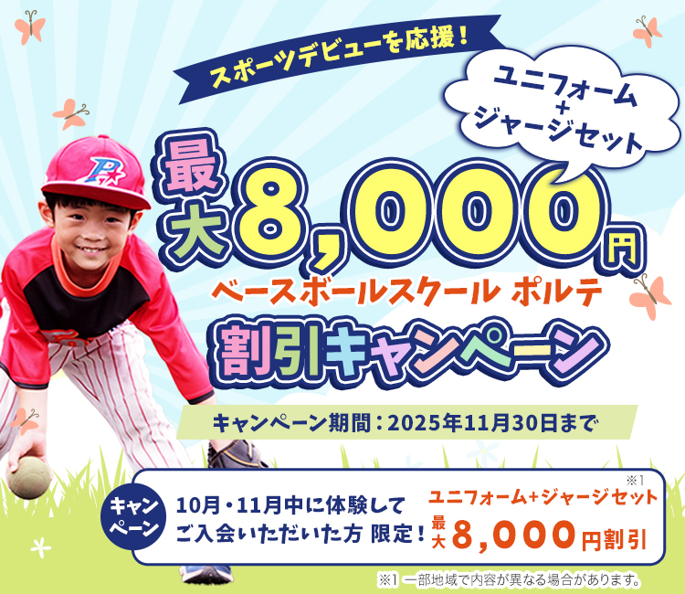 ベースボールスクールポルテでは、お得に習い事を始められるユニフォームセットの最大8,000円割引キャンペーンを2025年10月6日(月)から実施しております!